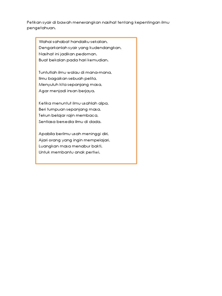 1 Dengarlah wahai anakanda Rajinlah belajar sepanjang masa Ilmu tiada pernah habis dieja sebagai bekal sepanjang usia 2 Dengan ilmu engkau terjaga Dari suramnya waktu dan masa. Contoh Syair Pendidikan Dengarlah para anak muda Rajinlah belajar dengan sepanjang masa Ilmu itu tak akan habis dieja Untuk bekal sepanjang usia Ayo ke sekolah jangan malas Belajar yang rajin di kelas Jaga sikap jangan menjadi orang culas Jangan biarkan hati yang berubah keras Ke sekolah luruskanlah niatmu Tekadkan hati untuk mencari ilmu. 2 Sekarang dunia sangatlah maju.